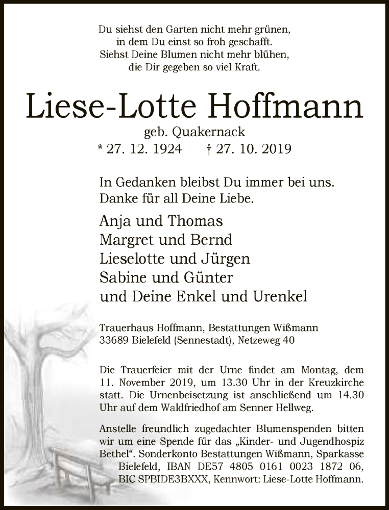 Hier finden Sie alle Traueranzeigen aus der Zeitung, die bisher für Liese-Lotte Hoffmann erschienen sind. Weitere Traueranzeigen, die in der Zeitung erscheinen, werden hier ebenfalls aufgelistet