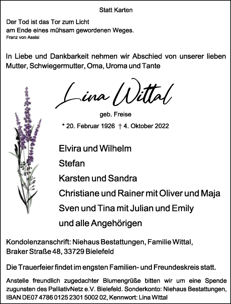 Hier finden Sie alle Traueranzeigen aus der Zeitung, die bisher für Lina Wittal erschienen sind. Weitere Traueranzeigen, die in der Zeitung erscheinen, werden hier ebenfalls aufgelistet