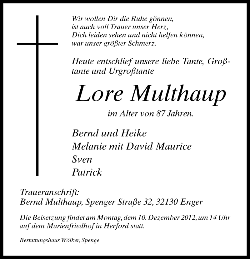 Hier finden Sie alle Traueranzeigen aus der Zeitung, die bisher für Lore Multhaup erschienen sind. Weitere Traueranzeigen, die in der Zeitung erscheinen, werden hier ebenfalls aufgelistet