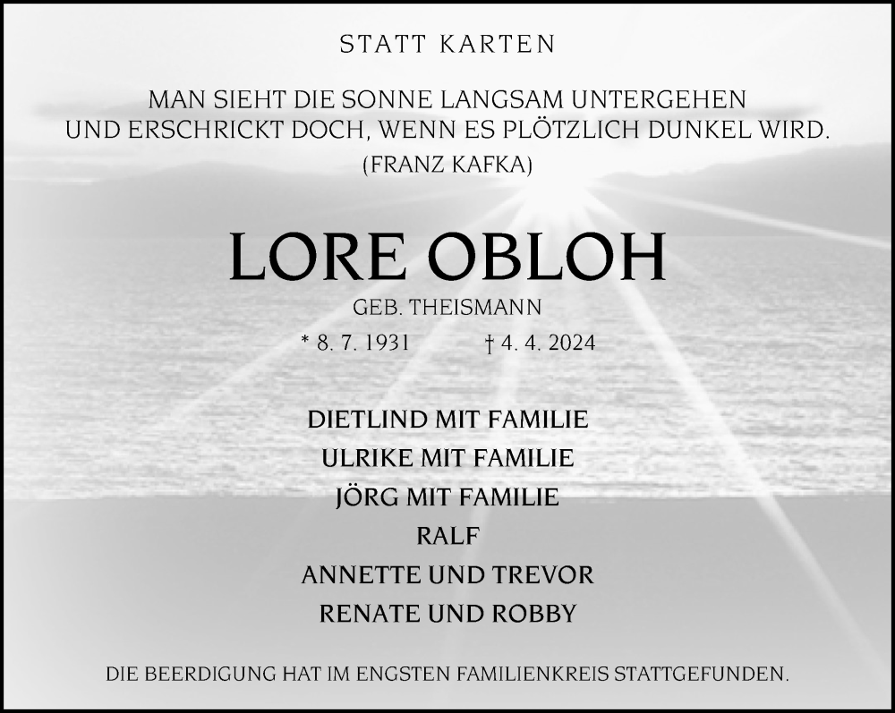 Hier finden Sie alle Traueranzeigen aus der Zeitung, die bisher für Lore Oblach erschienen sind. Weitere Traueranzeigen, die in der Zeitung erscheinen, werden hier ebenfalls aufgelistet