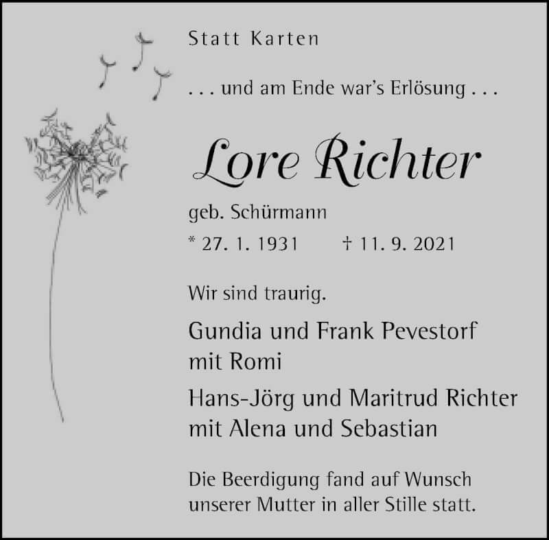 Hier finden Sie alle Traueranzeigen aus der Zeitung, die bisher für Lore Richter erschienen sind. Weitere Traueranzeigen, die in der Zeitung erscheinen, werden hier ebenfalls aufgelistet