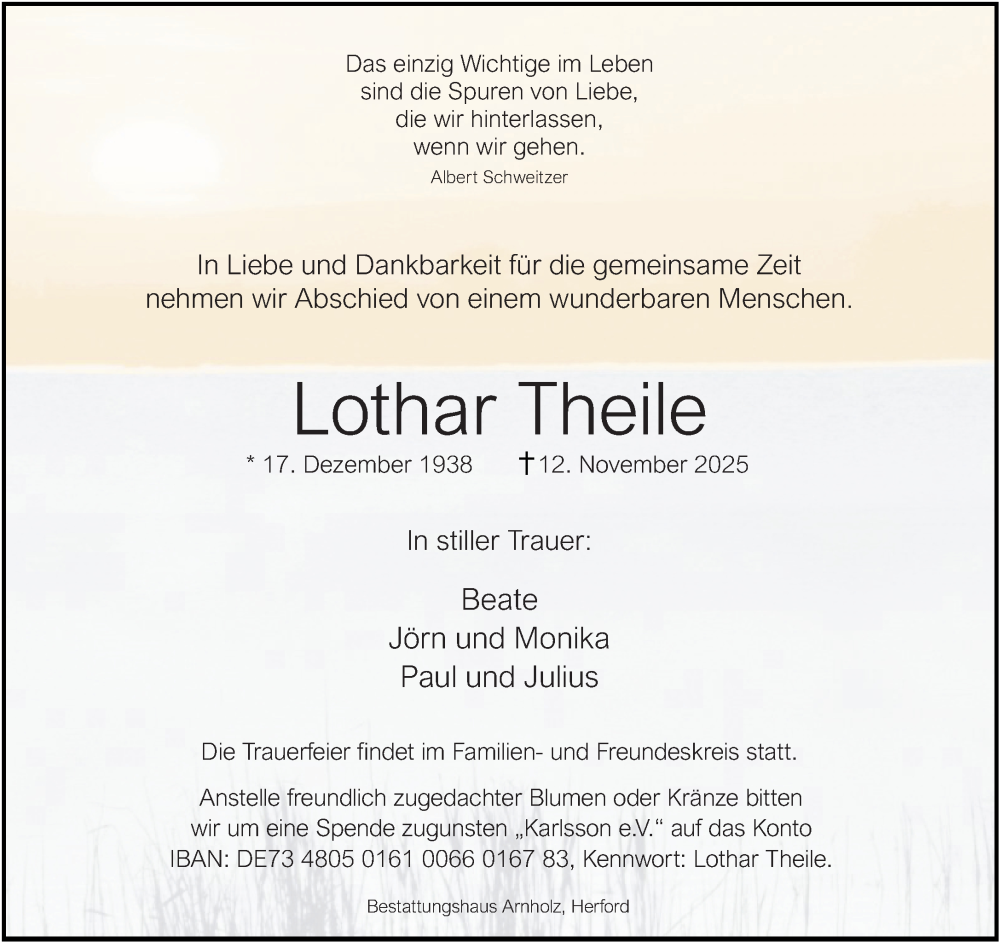 Hier finden Sie alle Traueranzeigen aus der Zeitung, die bisher für Lothar Theile erschienen sind. Weitere Traueranzeigen, die in der Zeitung erscheinen, werden hier ebenfalls aufgelistet