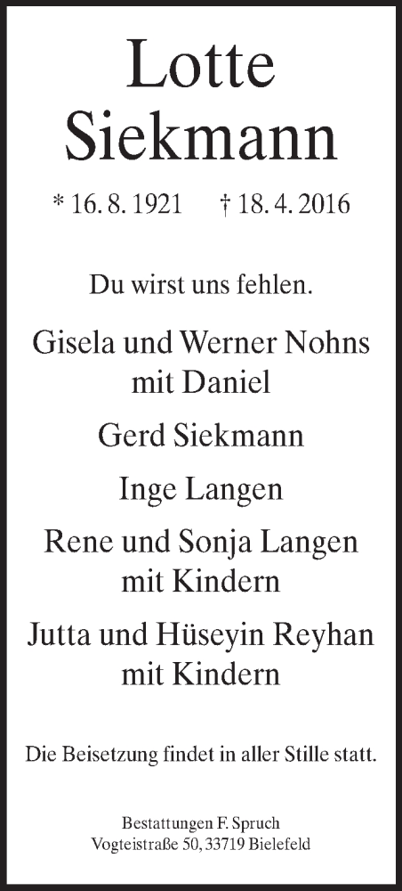 Hier finden Sie alle Traueranzeigen aus der Zeitung, die bisher für Lotte Siekmann erschienen sind. Weitere Traueranzeigen, die in der Zeitung erscheinen, werden hier ebenfalls aufgelistet