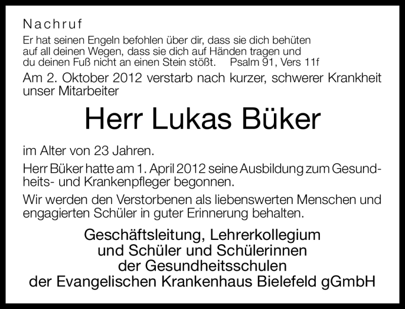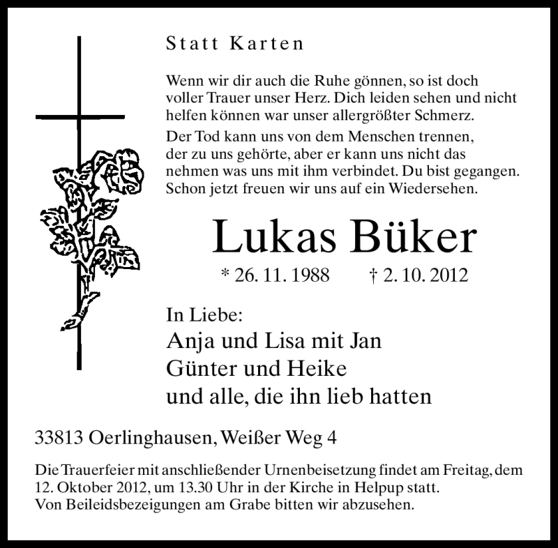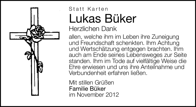 Hier finden Sie alle Traueranzeigen aus der Zeitung, die bisher für Lukas Büker erschienen sind. Weitere Traueranzeigen, die in der Zeitung erscheinen, werden hier ebenfalls aufgelistet