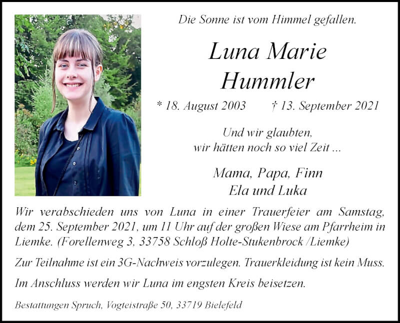 Hier finden Sie alle Traueranzeigen aus der Zeitung, die bisher für Luna Marie Hummler erschienen sind. Weitere Traueranzeigen, die in der Zeitung erscheinen, werden hier ebenfalls aufgelistet