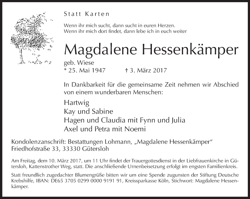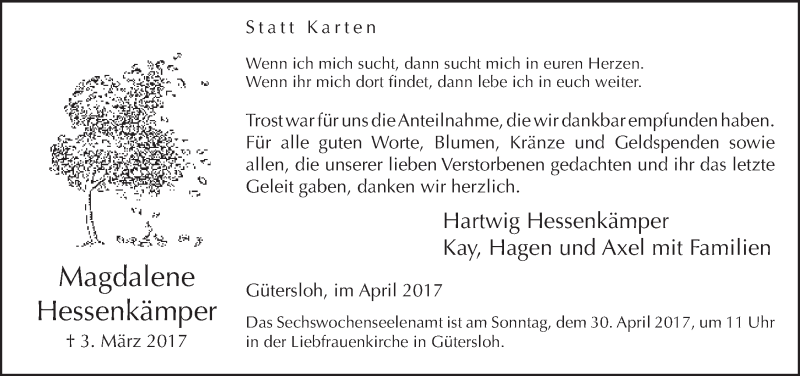 Hier finden Sie alle Traueranzeigen aus der Zeitung, die bisher für Magdalene Hessenkämper erschienen sind. Weitere Traueranzeigen, die in der Zeitung erscheinen, werden hier ebenfalls aufgelistet