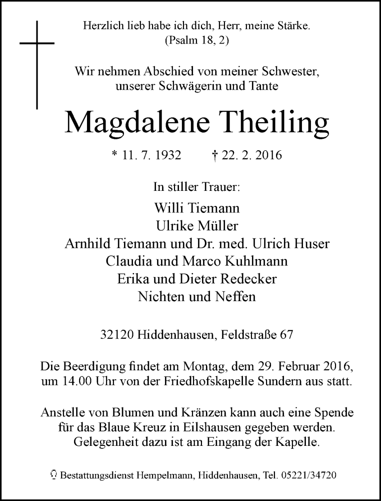 Hier finden Sie alle Traueranzeigen aus der Zeitung, die bisher für Magdalene Theiling erschienen sind. Weitere Traueranzeigen, die in der Zeitung erscheinen, werden hier ebenfalls aufgelistet