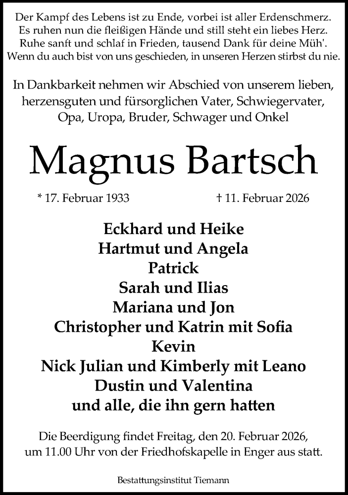 Hier finden Sie alle Traueranzeigen aus der Zeitung, die bisher für Magnus Bartsch erschienen sind. Weitere Traueranzeigen, die in der Zeitung erscheinen, werden hier ebenfalls aufgelistet