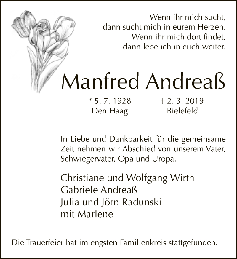 Hier finden Sie alle Traueranzeigen aus der Zeitung, die bisher für Manfred Andreaß erschienen sind. Weitere Traueranzeigen, die in der Zeitung erscheinen, werden hier ebenfalls aufgelistet