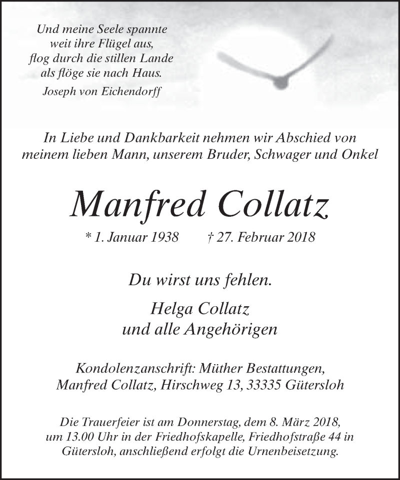 Hier finden Sie alle Traueranzeigen aus der Zeitung, die bisher für Manfred Collatz erschienen sind. Weitere Traueranzeigen, die in der Zeitung erscheinen, werden hier ebenfalls aufgelistet