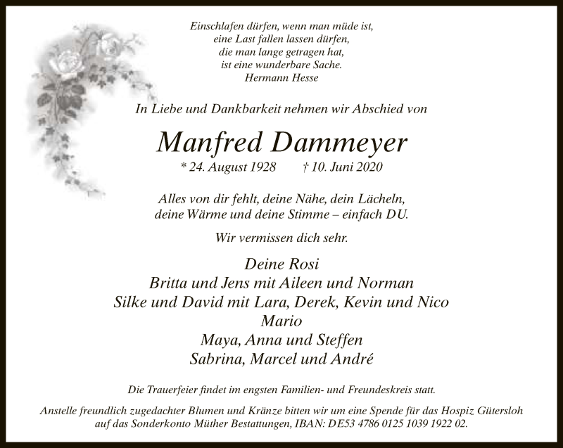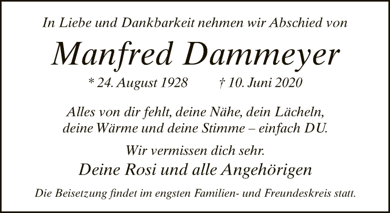 Hier finden Sie alle Traueranzeigen aus der Zeitung, die bisher für Manfred Dammeyer erschienen sind. Weitere Traueranzeigen, die in der Zeitung erscheinen, werden hier ebenfalls aufgelistet