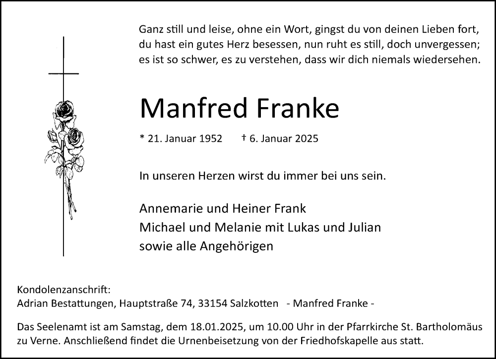 Hier finden Sie alle Traueranzeigen aus der Zeitung, die bisher für Manfred Franke erschienen sind. Weitere Traueranzeigen, die in der Zeitung erscheinen, werden hier ebenfalls aufgelistet