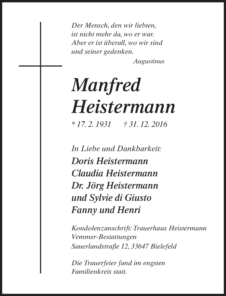 Hier finden Sie alle Traueranzeigen aus der Zeitung, die bisher für Manfred Heistermann erschienen sind. Weitere Traueranzeigen, die in der Zeitung erscheinen, werden hier ebenfalls aufgelistet