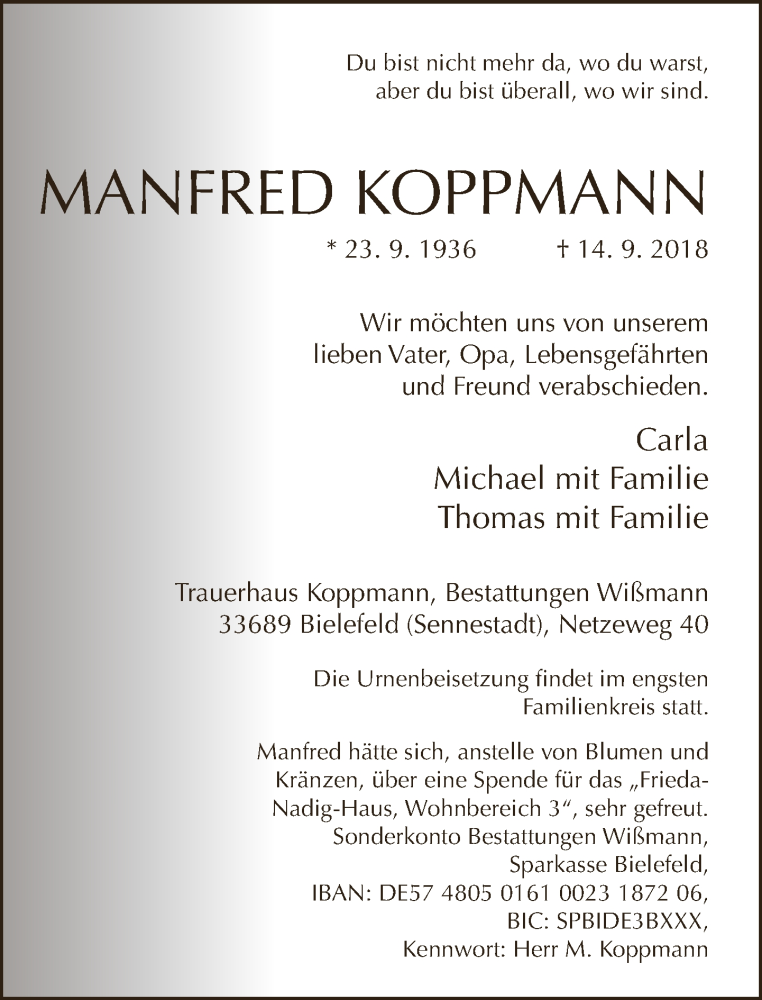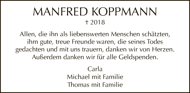 Hier finden Sie alle Traueranzeigen aus der Zeitung, die bisher für Manfred Koppmann erschienen sind. Weitere Traueranzeigen, die in der Zeitung erscheinen, werden hier ebenfalls aufgelistet
