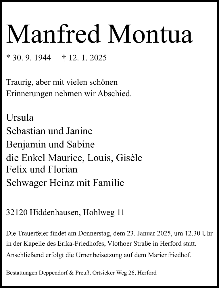 Hier finden Sie alle Traueranzeigen aus der Zeitung, die bisher für Manfred Montua erschienen sind. Weitere Traueranzeigen, die in der Zeitung erscheinen, werden hier ebenfalls aufgelistet