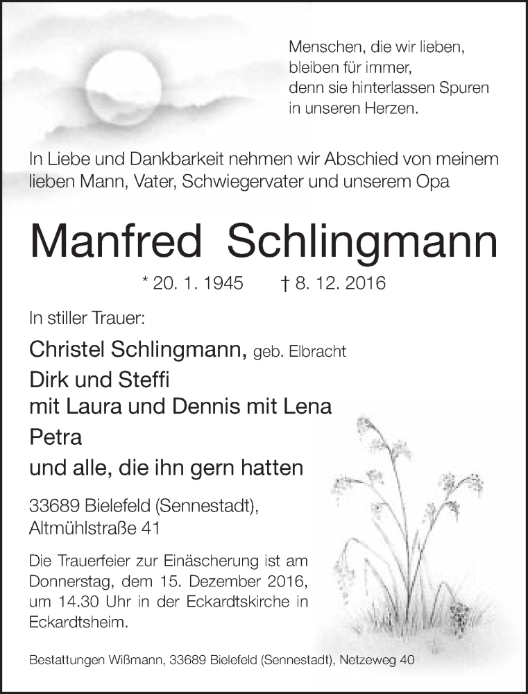 Hier finden Sie alle Traueranzeigen aus der Zeitung, die bisher für Manfred Schlingmann erschienen sind. Weitere Traueranzeigen, die in der Zeitung erscheinen, werden hier ebenfalls aufgelistet