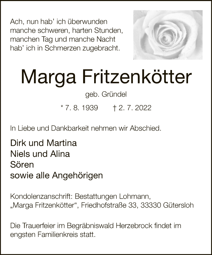 Hier finden Sie alle Traueranzeigen aus der Zeitung, die bisher für Marga Fritzenkötter erschienen sind. Weitere Traueranzeigen, die in der Zeitung erscheinen, werden hier ebenfalls aufgelistet
