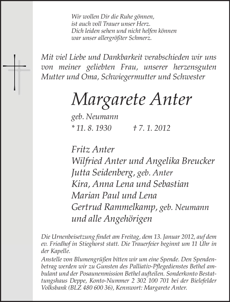 Hier finden Sie alle Traueranzeigen aus der Zeitung, die bisher für Margarete Anter erschienen sind. Weitere Traueranzeigen, die in der Zeitung erscheinen, werden hier ebenfalls aufgelistet