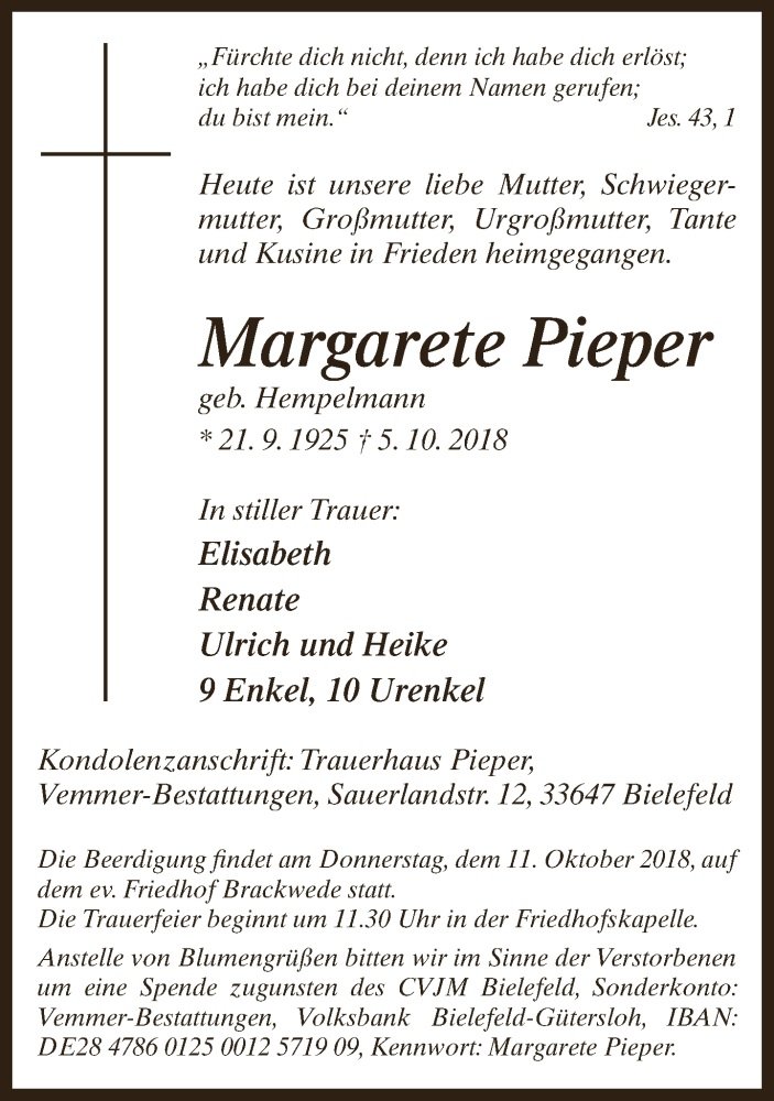 Hier finden Sie alle Traueranzeigen aus der Zeitung, die bisher für Margarete Pieper erschienen sind. Weitere Traueranzeigen, die in der Zeitung erscheinen, werden hier ebenfalls aufgelistet