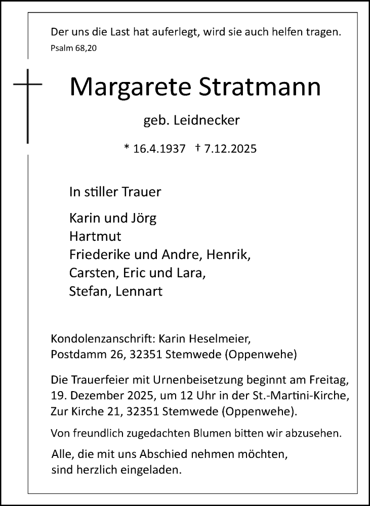 Hier finden Sie alle Traueranzeigen aus der Zeitung, die bisher für Margarete Stratmann erschienen sind. Weitere Traueranzeigen, die in der Zeitung erscheinen, werden hier ebenfalls aufgelistet