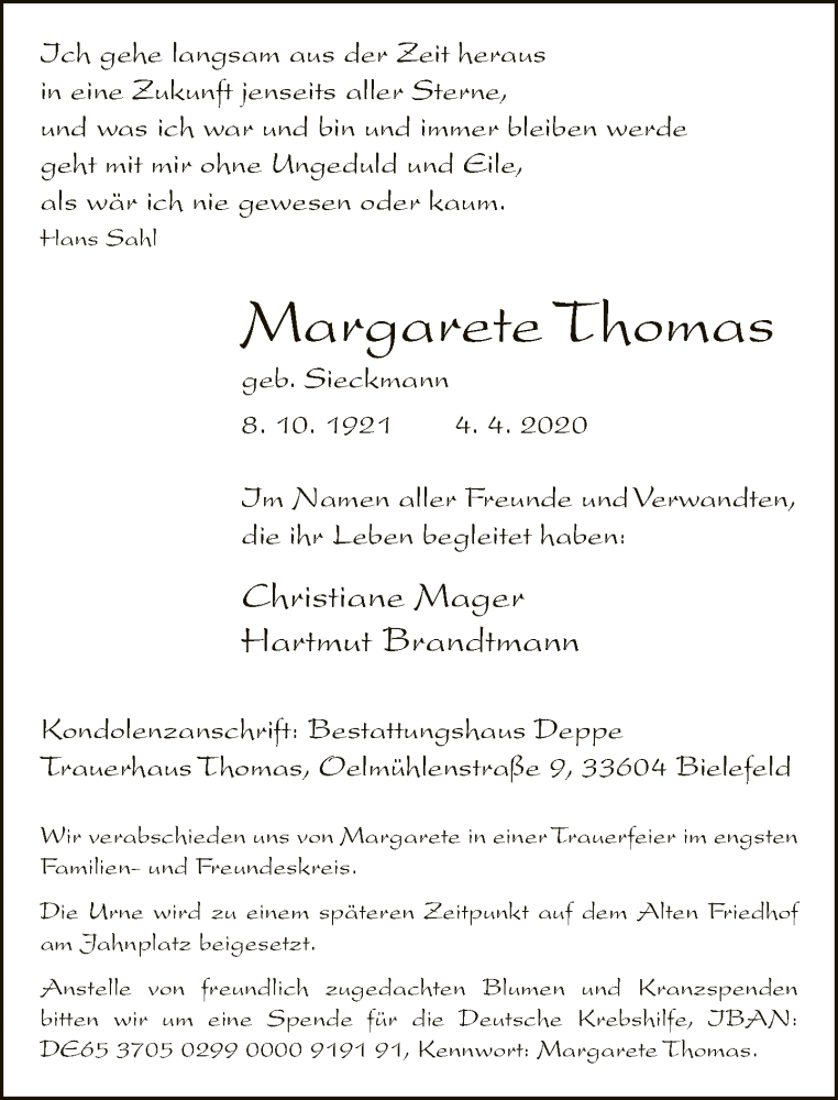 Hier finden Sie alle Traueranzeigen aus der Zeitung, die bisher für Margarete Thomas erschienen sind. Weitere Traueranzeigen, die in der Zeitung erscheinen, werden hier ebenfalls aufgelistet