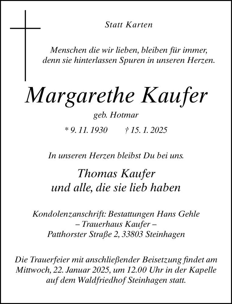 Hier finden Sie alle Traueranzeigen aus der Zeitung, die bisher für Margarethe Kaufer erschienen sind. Weitere Traueranzeigen, die in der Zeitung erscheinen, werden hier ebenfalls aufgelistet