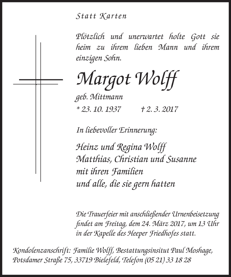 Hier finden Sie alle Traueranzeigen aus der Zeitung, die bisher für Margot Wolff erschienen sind. Weitere Traueranzeigen, die in der Zeitung erscheinen, werden hier ebenfalls aufgelistet