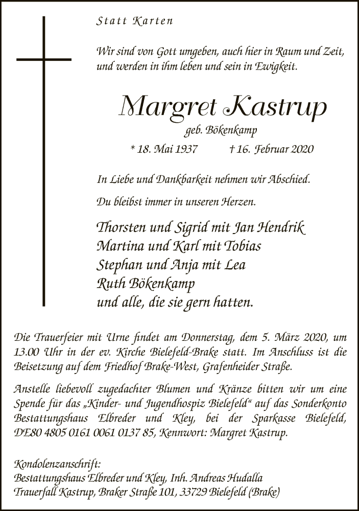 Hier finden Sie alle Traueranzeigen aus der Zeitung, die bisher für Margret Kastrup erschienen sind. Weitere Traueranzeigen, die in der Zeitung erscheinen, werden hier ebenfalls aufgelistet