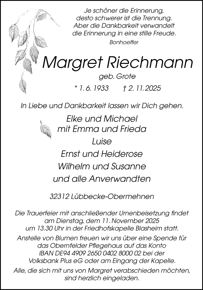Hier finden Sie alle Traueranzeigen aus der Zeitung, die bisher für Margret Riechmann erschienen sind. Weitere Traueranzeigen, die in der Zeitung erscheinen, werden hier ebenfalls aufgelistet