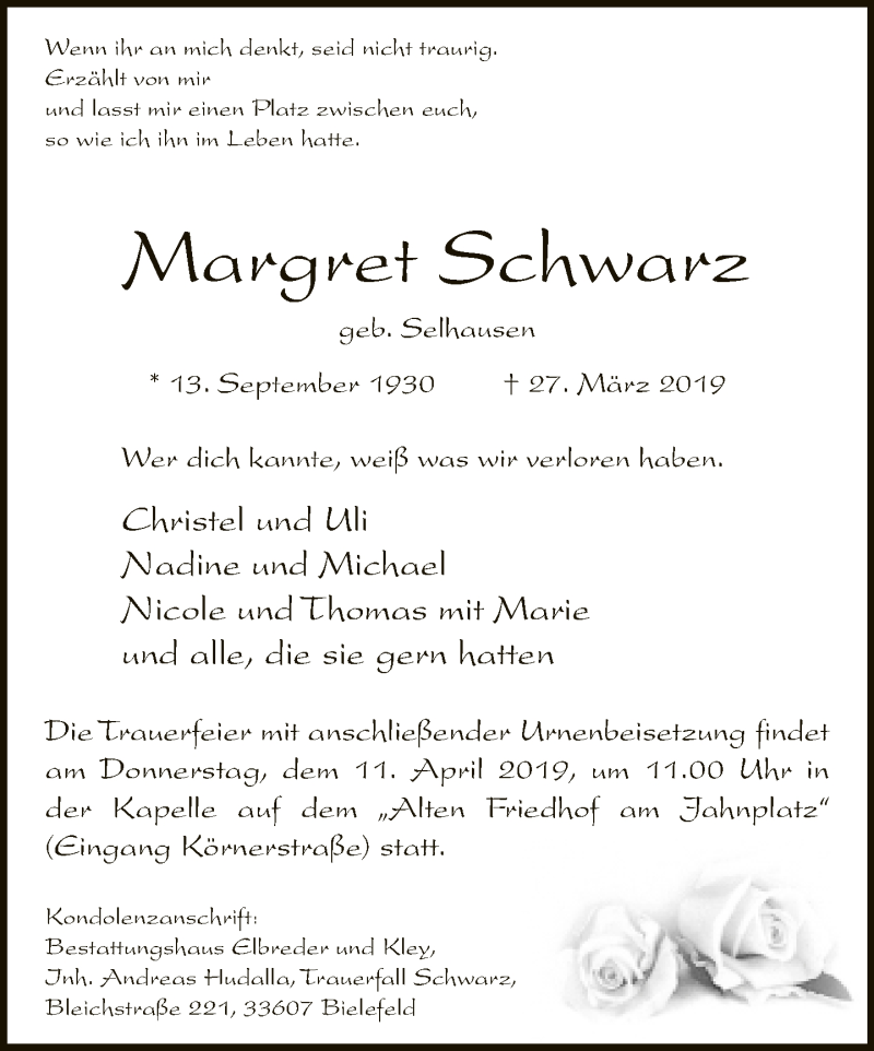 Hier finden Sie alle Traueranzeigen aus der Zeitung, die bisher für Margret Schwarz erschienen sind. Weitere Traueranzeigen, die in der Zeitung erscheinen, werden hier ebenfalls aufgelistet