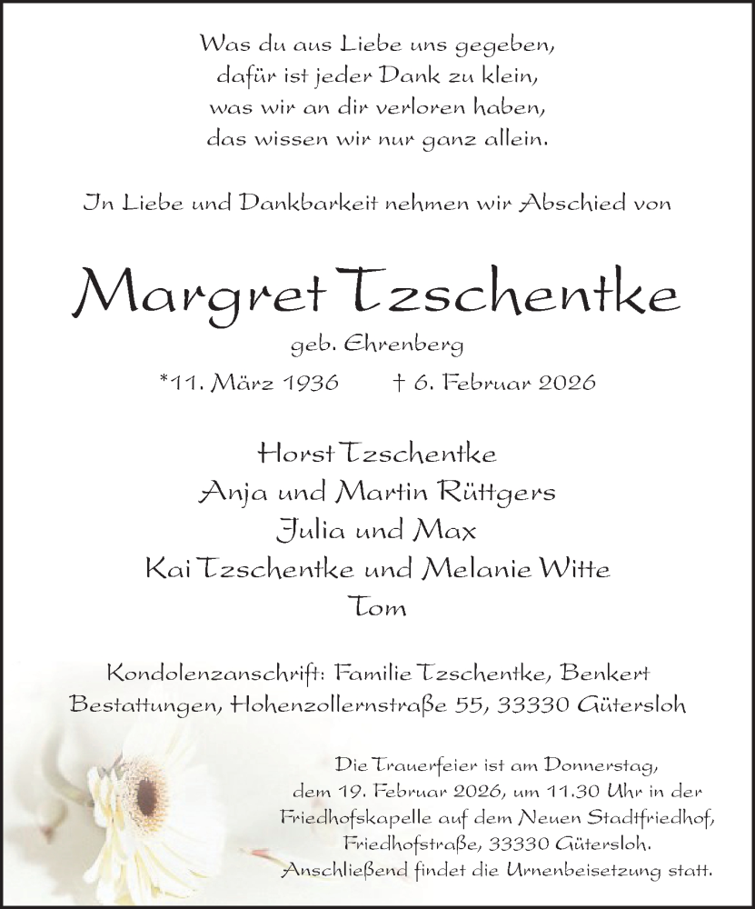 Hier finden Sie alle Traueranzeigen aus der Zeitung, die bisher für Margret Tzschentke erschienen sind. Weitere Traueranzeigen, die in der Zeitung erscheinen, werden hier ebenfalls aufgelistet