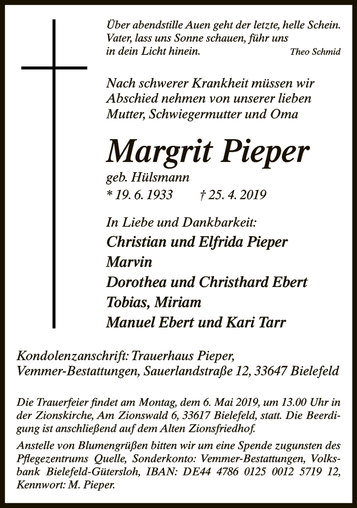 Hier finden Sie alle Traueranzeigen aus der Zeitung, die bisher für Margrit Pieper erschienen sind. Weitere Traueranzeigen, die in der Zeitung erscheinen, werden hier ebenfalls aufgelistet