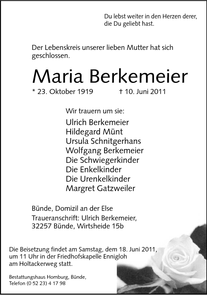 Hier finden Sie alle Traueranzeigen aus der Zeitung, die bisher für Maria Berkemeier erschienen sind. Weitere Traueranzeigen, die in der Zeitung erscheinen, werden hier ebenfalls aufgelistet