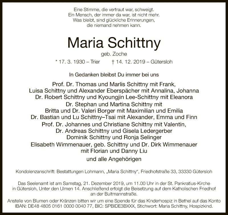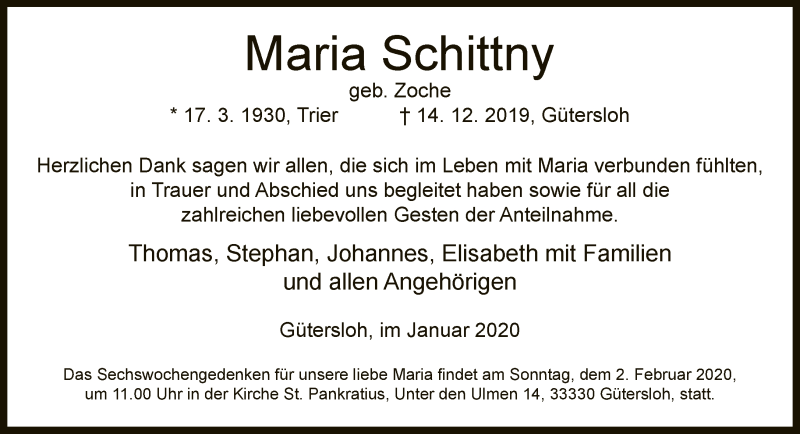 Hier finden Sie alle Traueranzeigen aus der Zeitung, die bisher für Maria Schittny erschienen sind. Weitere Traueranzeigen, die in der Zeitung erscheinen, werden hier ebenfalls aufgelistet