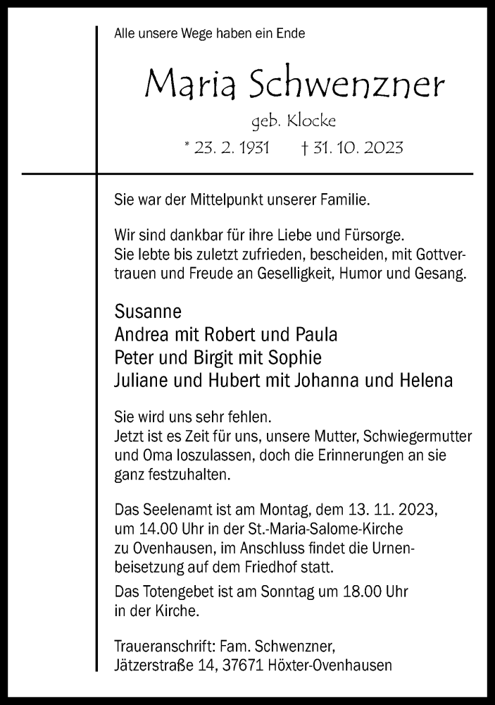Hier finden Sie alle Traueranzeigen aus der Zeitung, die bisher für Maria Schwenzner erschienen sind. Weitere Traueranzeigen, die in der Zeitung erscheinen, werden hier ebenfalls aufgelistet