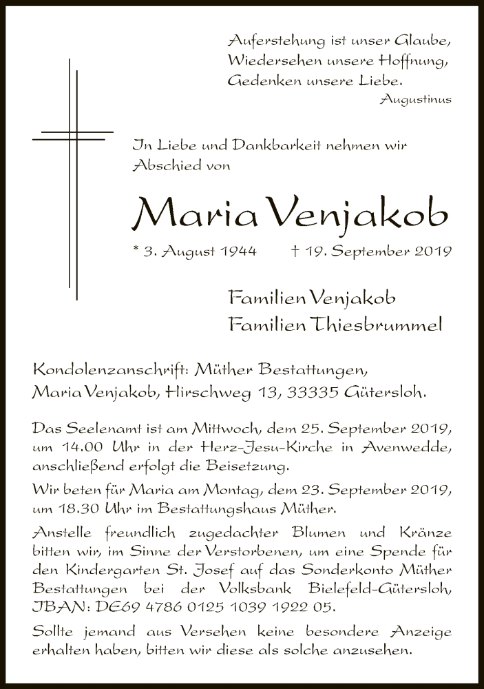 Hier finden Sie alle Traueranzeigen aus der Zeitung, die bisher für Maria Venjakob erschienen sind. Weitere Traueranzeigen, die in der Zeitung erscheinen, werden hier ebenfalls aufgelistet
