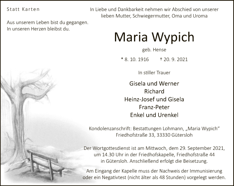 Hier finden Sie alle Traueranzeigen aus der Zeitung, die bisher für Maria Wypich erschienen sind. Weitere Traueranzeigen, die in der Zeitung erscheinen, werden hier ebenfalls aufgelistet