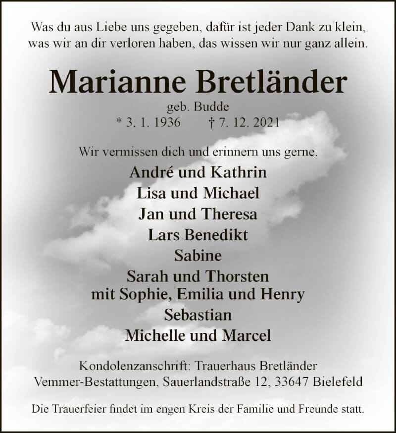 Hier finden Sie alle Traueranzeigen aus der Zeitung, die bisher für Marianne Bretländer erschienen sind. Weitere Traueranzeigen, die in der Zeitung erscheinen, werden hier ebenfalls aufgelistet