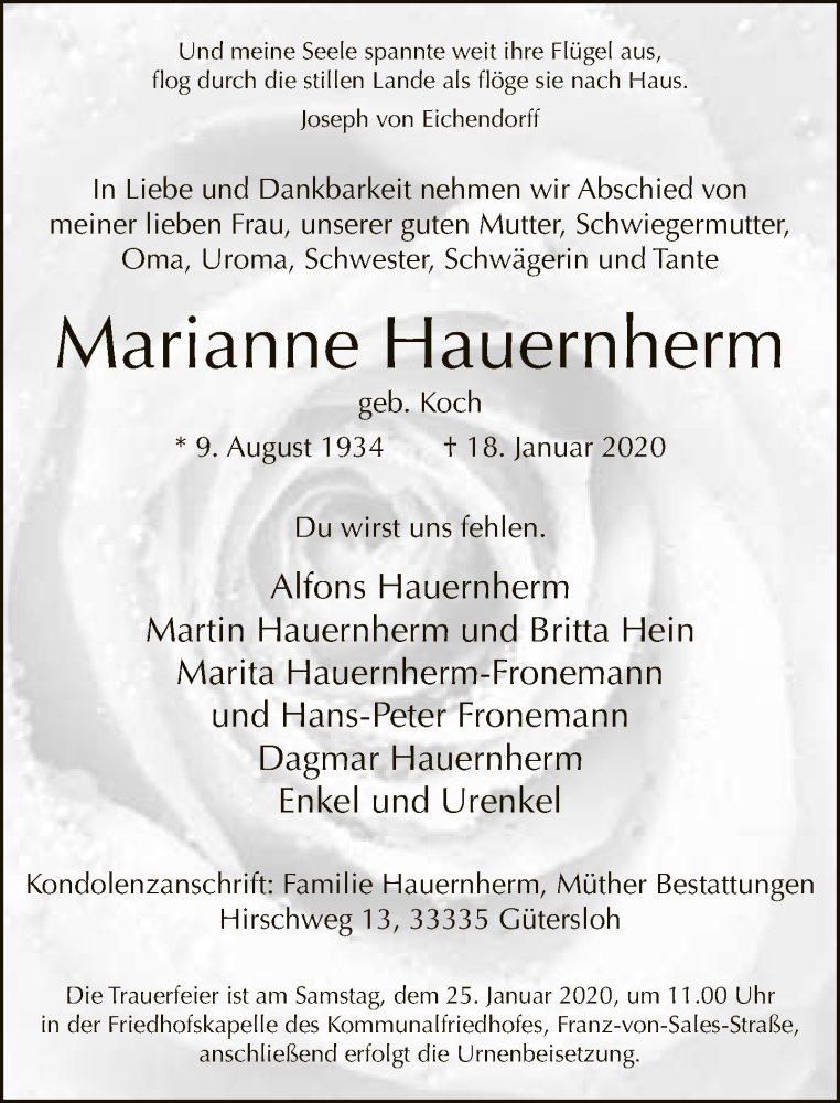 Hier finden Sie alle Traueranzeigen aus der Zeitung, die bisher für Marianne Hauernherm erschienen sind. Weitere Traueranzeigen, die in der Zeitung erscheinen, werden hier ebenfalls aufgelistet