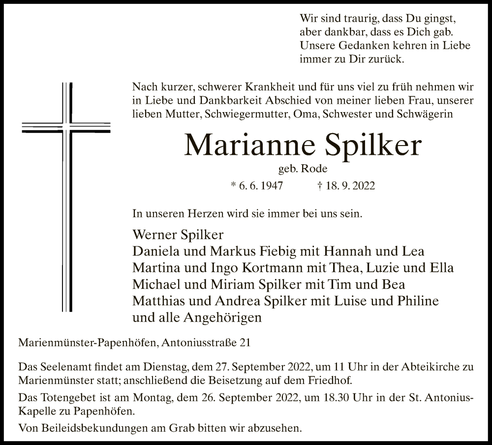 Hier finden Sie alle Traueranzeigen aus der Zeitung, die bisher für Marianne Spilker erschienen sind. Weitere Traueranzeigen, die in der Zeitung erscheinen, werden hier ebenfalls aufgelistet