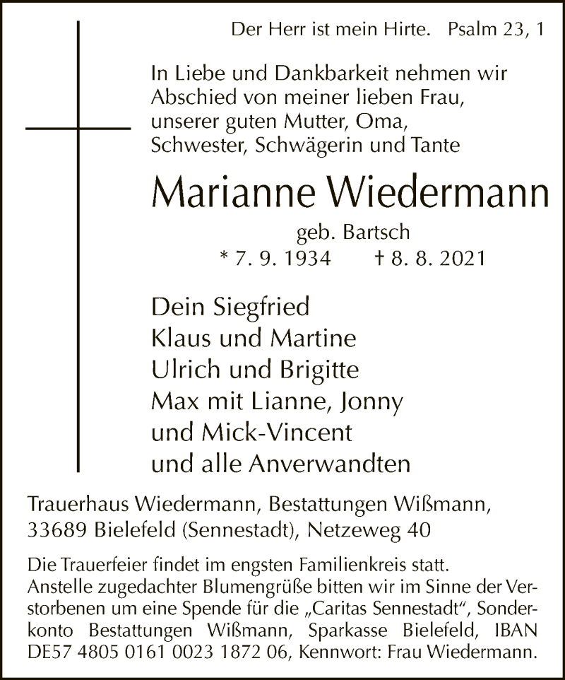Hier finden Sie alle Traueranzeigen aus der Zeitung, die bisher für Marianne Wiedermann erschienen sind. Weitere Traueranzeigen, die in der Zeitung erscheinen, werden hier ebenfalls aufgelistet