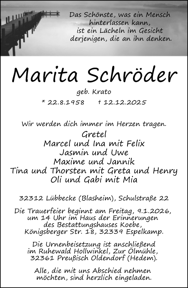 Hier finden Sie alle Traueranzeigen aus der Zeitung, die bisher für Marita Schröder erschienen sind. Weitere Traueranzeigen, die in der Zeitung erscheinen, werden hier ebenfalls aufgelistet