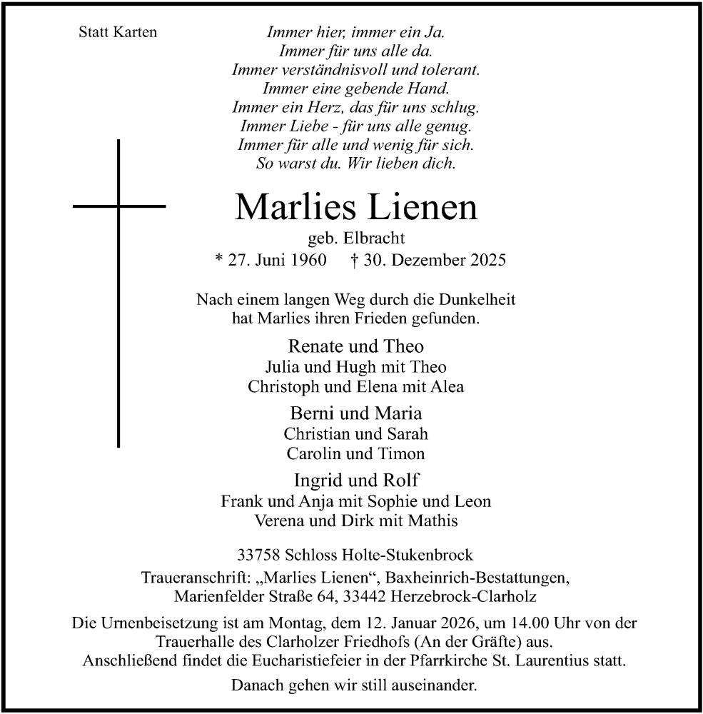 Hier finden Sie alle Traueranzeigen aus der Zeitung, die bisher für Marlies Lienen erschienen sind. Weitere Traueranzeigen, die in der Zeitung erscheinen, werden hier ebenfalls aufgelistet