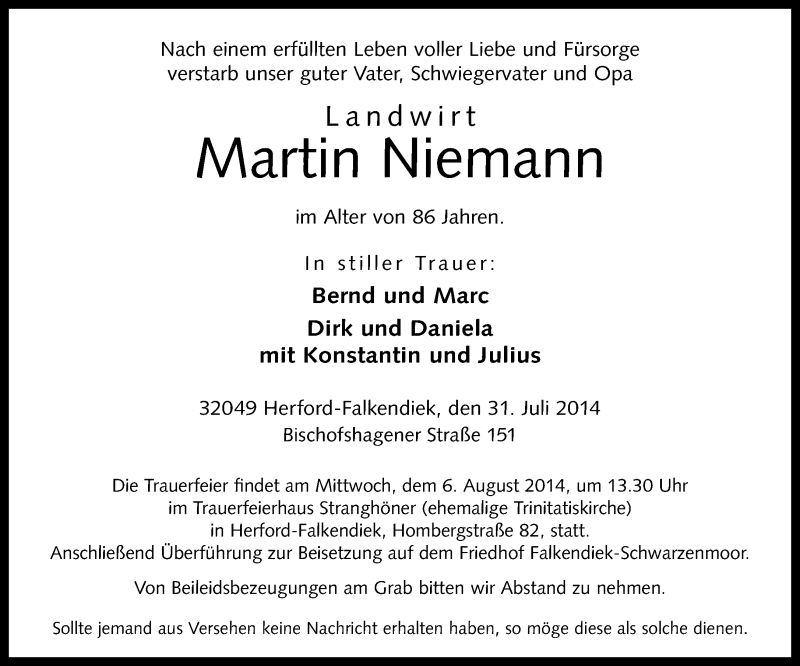 Hier finden Sie alle Traueranzeigen aus der Zeitung, die bisher für Martin Niemann erschienen sind. Weitere Traueranzeigen, die in der Zeitung erscheinen, werden hier ebenfalls aufgelistet