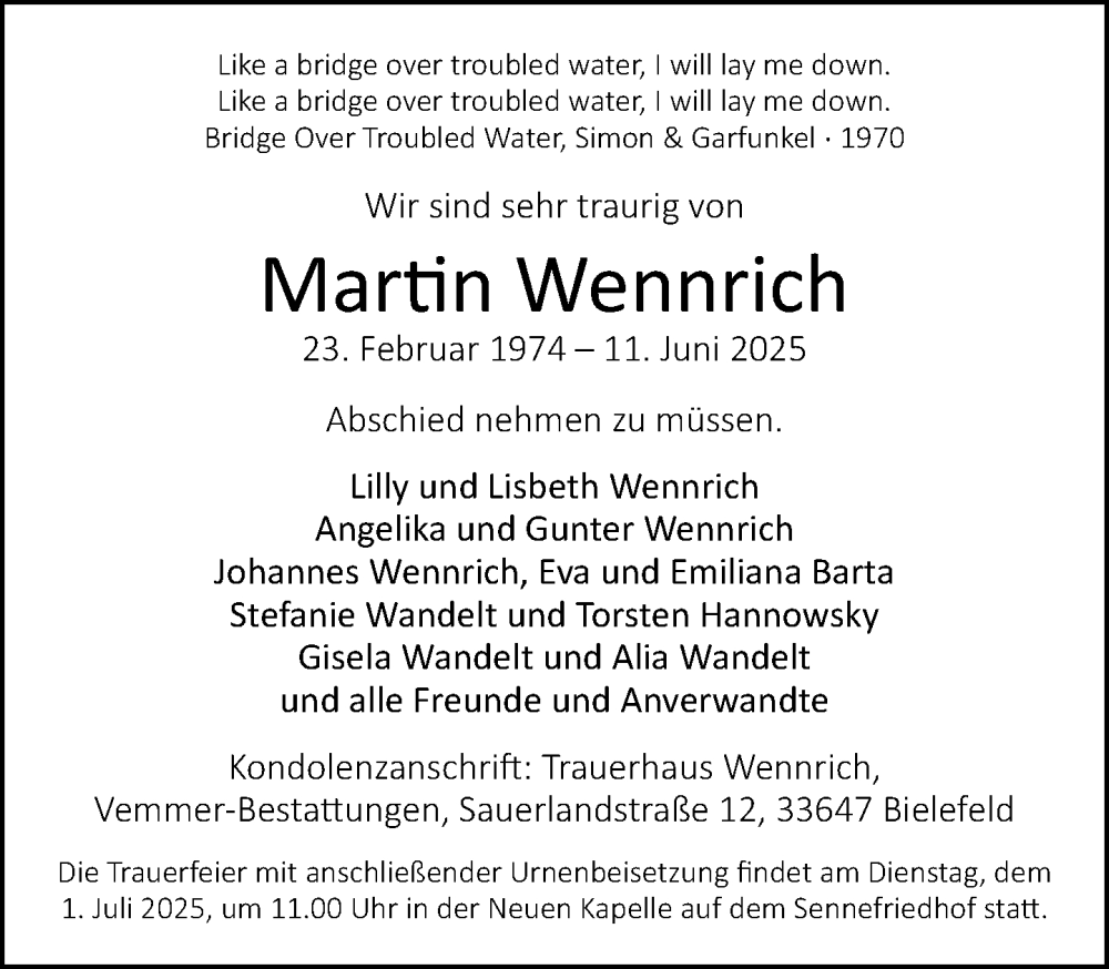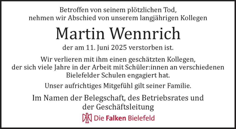 Hier finden Sie alle Traueranzeigen aus der Zeitung, die bisher für Martin Wennrich erschienen sind. Weitere Traueranzeigen, die in der Zeitung erscheinen, werden hier ebenfalls aufgelistet