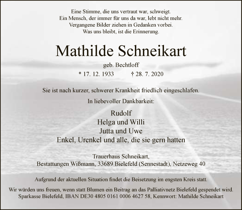 Hier finden Sie alle Traueranzeigen aus der Zeitung, die bisher für Mathilde Schneikart erschienen sind. Weitere Traueranzeigen, die in der Zeitung erscheinen, werden hier ebenfalls aufgelistet