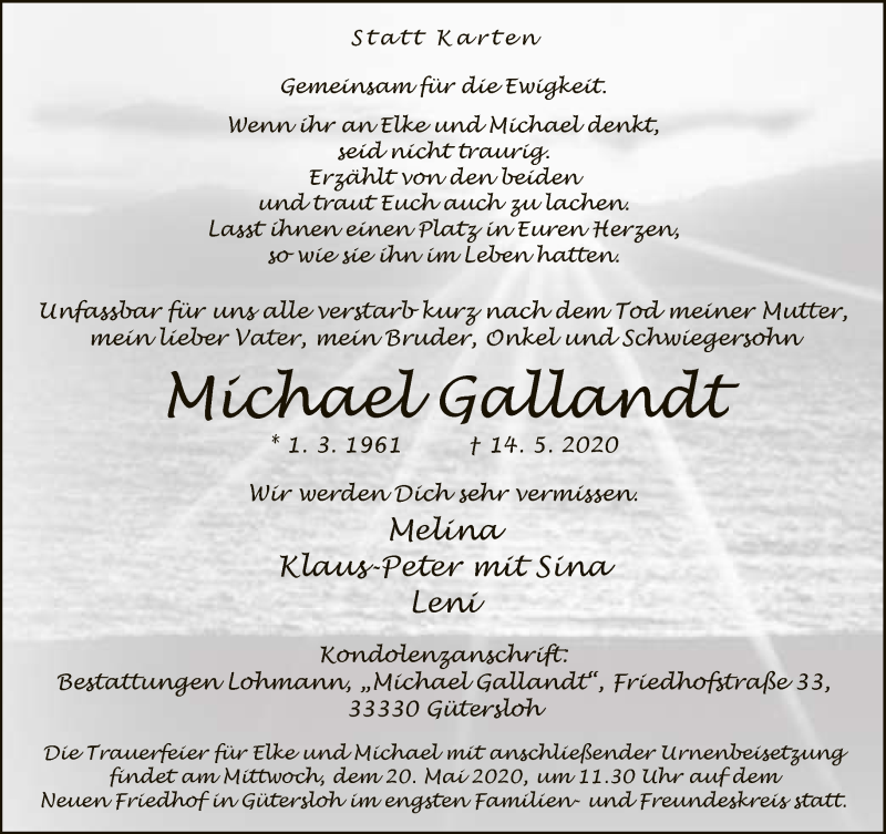 Hier finden Sie alle Traueranzeigen aus der Zeitung, die bisher für Michael Gallandt erschienen sind. Weitere Traueranzeigen, die in der Zeitung erscheinen, werden hier ebenfalls aufgelistet