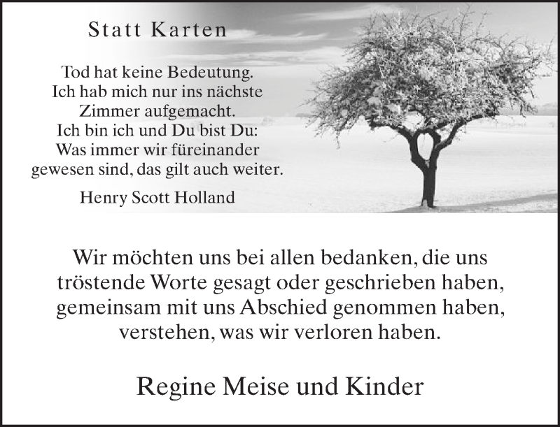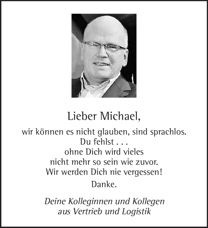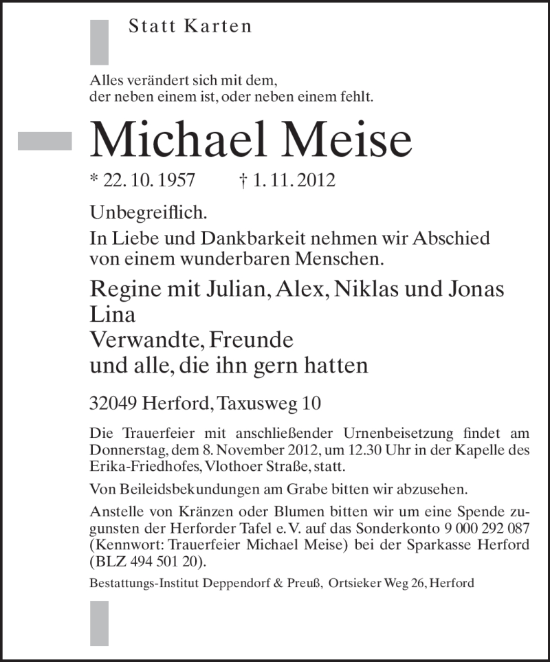Hier finden Sie alle Traueranzeigen aus der Zeitung, die bisher für Michael Meise erschienen sind. Weitere Traueranzeigen, die in der Zeitung erscheinen, werden hier ebenfalls aufgelistet