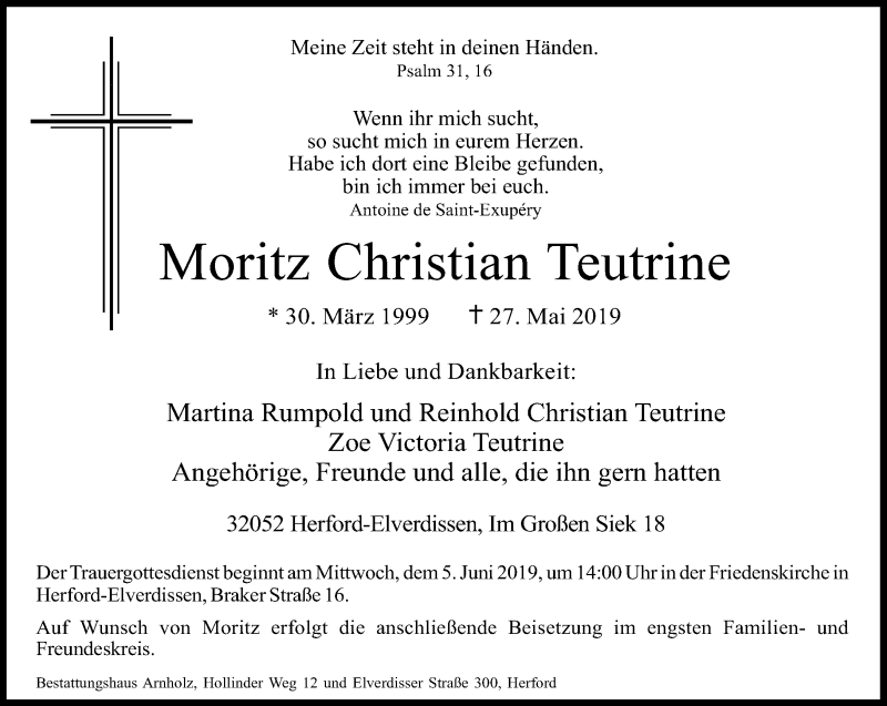 Hier finden Sie alle Traueranzeigen aus der Zeitung, die bisher für Moritz Christian Teutrine erschienen sind. Weitere Traueranzeigen, die in der Zeitung erscheinen, werden hier ebenfalls aufgelistet