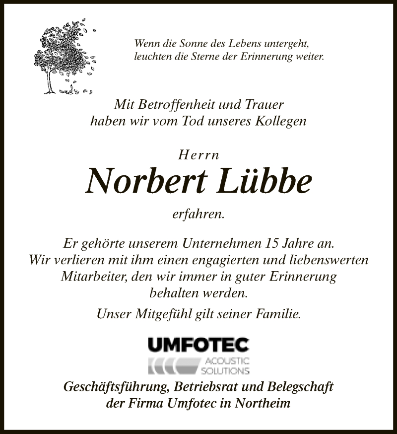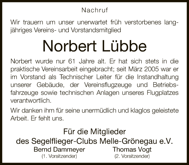 Hier finden Sie alle Traueranzeigen aus der Zeitung, die bisher für Norbert Lübbe erschienen sind. Weitere Traueranzeigen, die in der Zeitung erscheinen, werden hier ebenfalls aufgelistet
